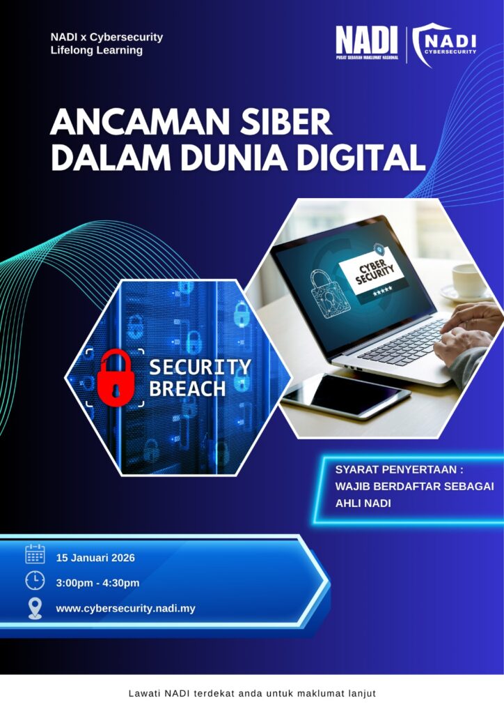 Jemputan untuk menyertai Webinar NADI x Cybersecurity bertarikh 15 Januari 2026 yang bertajuk Ancaman Siber Dalam Dunia Digital. Butiran lanjut adalah seperti dibawah: